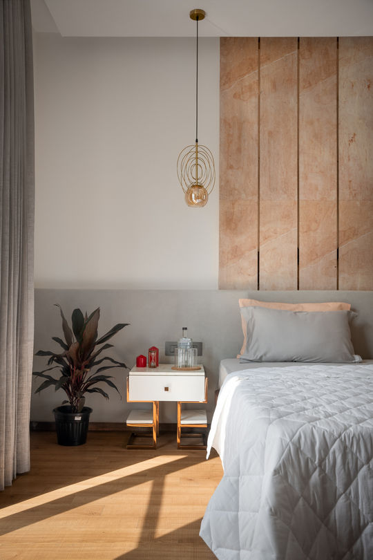 The design brief also included a noble material preference of marble and wood to emphasize luxury. The mood board of this home is an economical take on these materials, while ensuring that the design exudes an aura of opulence. Beige tiles, brown veneer and highlights of brass set a soothing tone for the rest of the colours and textures to build upon.