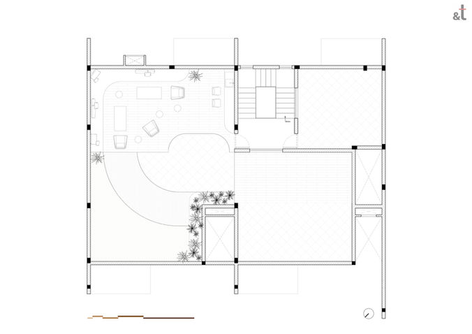 With bedrooms on either side, the corridor on the first floor culminates at the bar. Hues of brown meander through the two floors establishing a monochrome spectrum. The light tones of the foyer get progressively darker upon delving deeper into the house and conclude in a chiaroscuro-esque bar. The space employees the use of black and white tiles in combination with wooden flooring to demarcate between the bar and seating area. The back-lit glass shelves in the black semi-circle case is the main protagonist.
