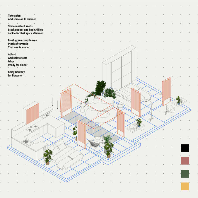 The essence of this 75 sq.m. apartment lies in its intervention of providing the client with a biophilic setting where he can easily reorganize his plants around the house. The planning of the house gives him a free rein to be able to move them out into the sun and shuffle them on the way back in. This evolving layout along with the colour palette helps achieve the intended brief with a different aesthetic every time. The design aims to bring about a minimal, low-maintenance home with a quirky flair on a constrained budget.