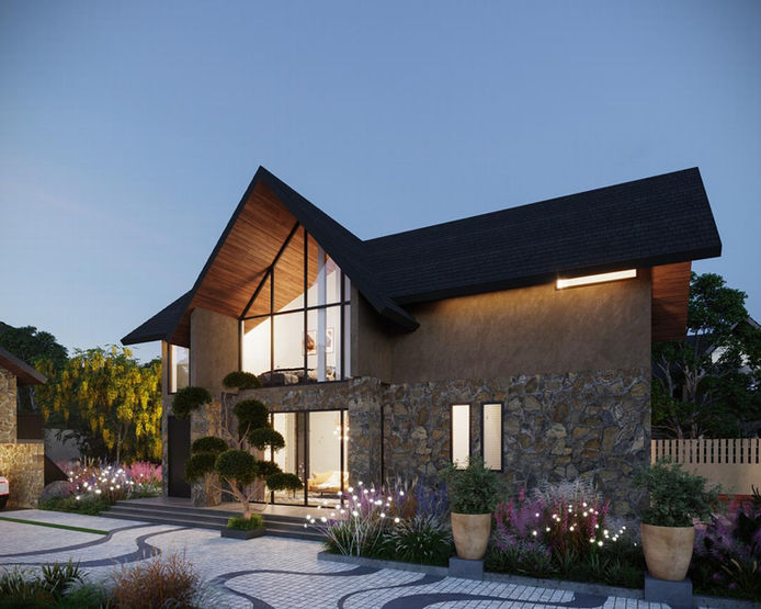 Each villa features clean, modern lines and sloped roofs inspired by the nearby hills. Large windows bring in natural light and open up to views of the forest and countryside, creating a calm connection between the indoors and outdoors.