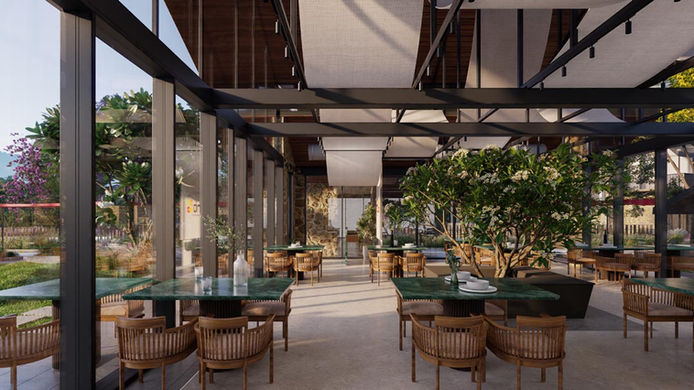 The development includes shared amenities such as a restaurant, a clubhouse with a pool, a play area with a basketball court, and a 40-foot viewing tower overlooking the landscape.